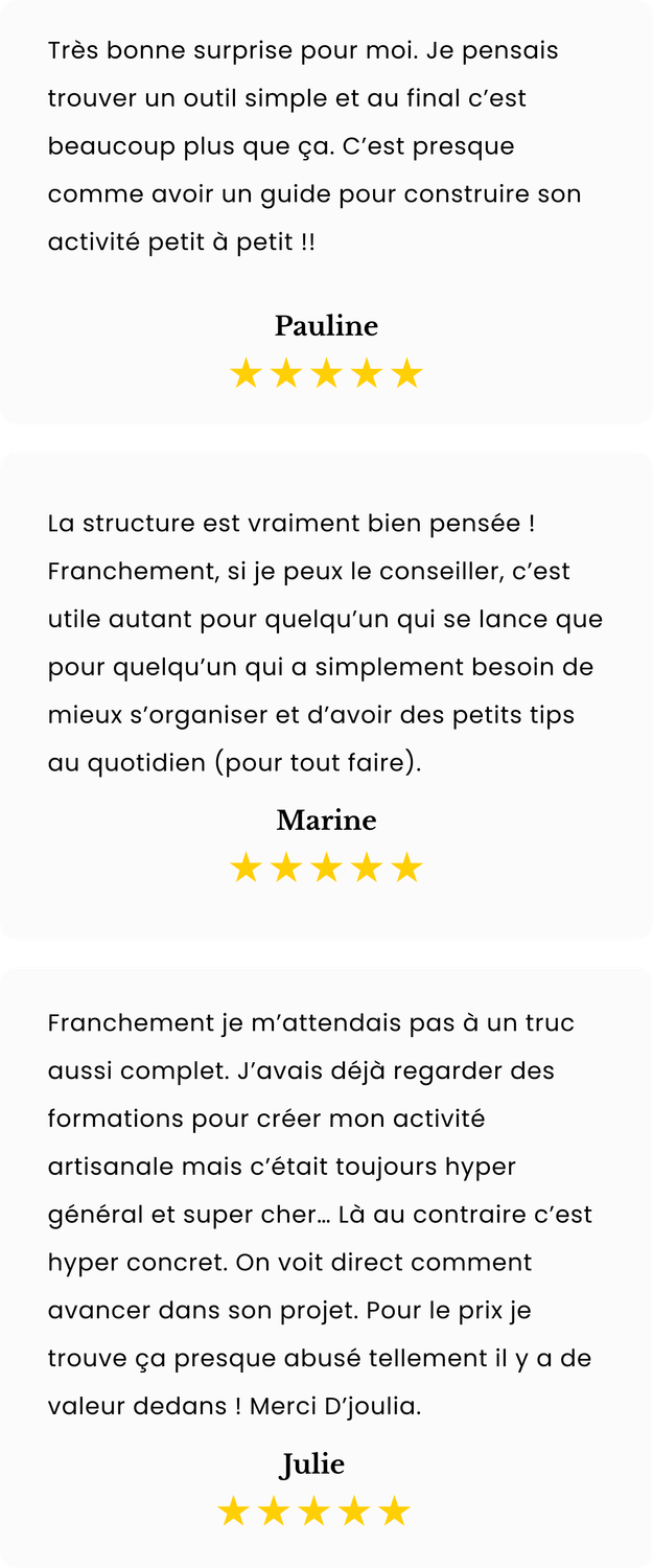 Elle est née d’un besoin vital de structure quotidienne, loin des formations à trois chiffres. Parce qu’on le sait : mieux vaut investir dans l’outillage de son atelier et le support de son business que dans des conseils qui, une fois lancés, ne servent plus à rien. Je l’ai créée parce que j’aurais aimé l’avoir à mes débuts : un outil simple, concret, et vraiment pensé pour les artisan·es qui travaillent seul·es.