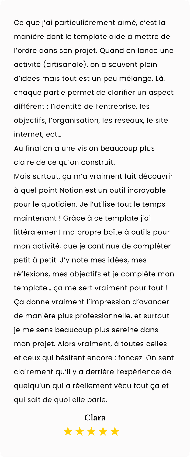 Ce template te donne le cadre, la direction et la clarté pour construire, structurer ou relancer ton entreprise artisanale, sans multiplier les outils, sans te perdre, et à ton rythme.