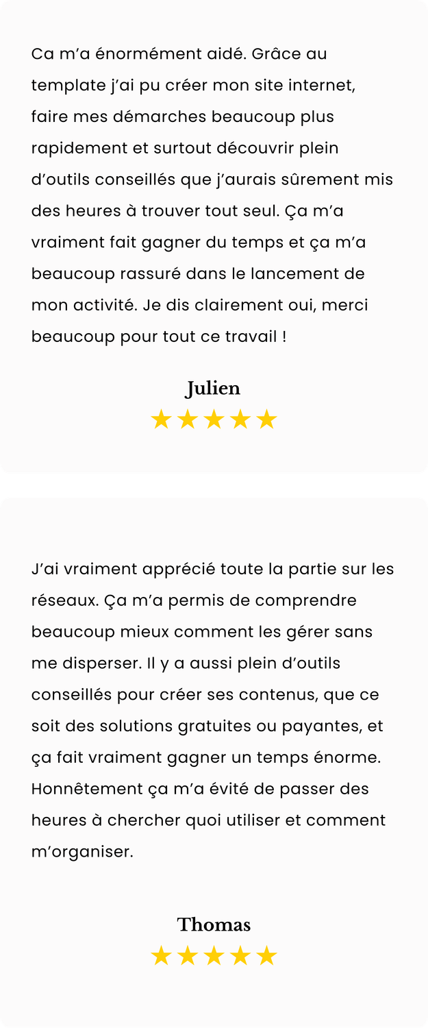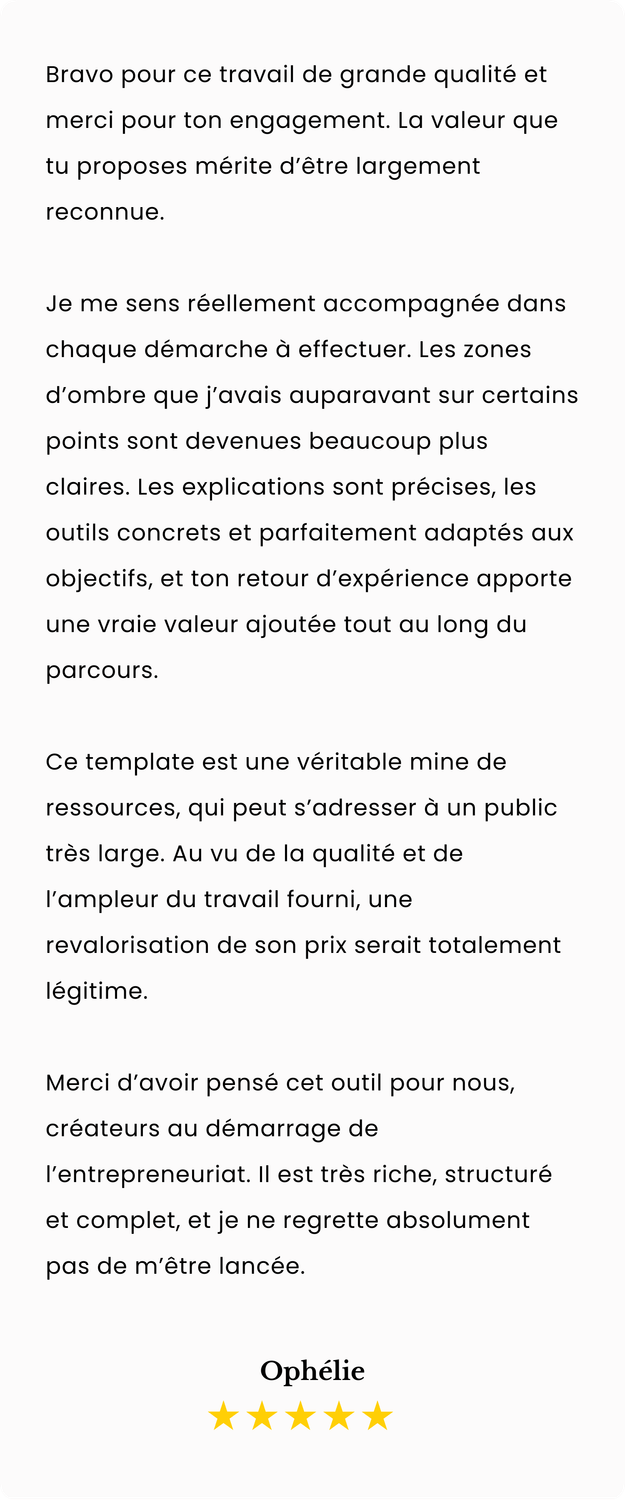 Ce template ne remplace pas une formation diplômante ni un accompagnement personnalisé, mais il t’évite clairement des formations entre 700 à 1 600 € et des heures (voire des semaines) de recherches, ou ces moments où l’on découvre les démarches sur le tas, sans toujours savoir quoi faire ni quoi anticiper, ce qui est totalement normal quand on débute.