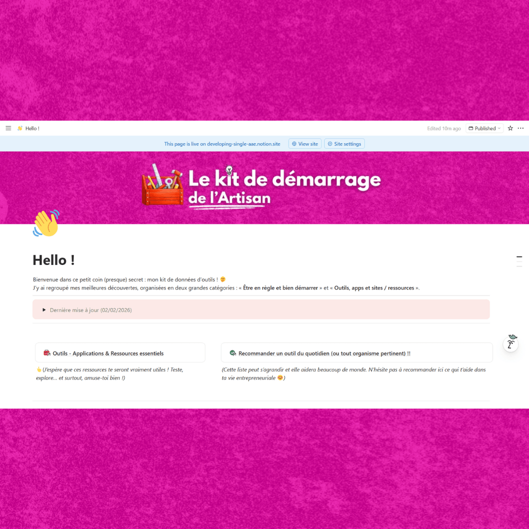 Cette boîte à outils est la première version de mon espace Notion : celui que j’utilise aujourd’hui pour piloter mon activité !